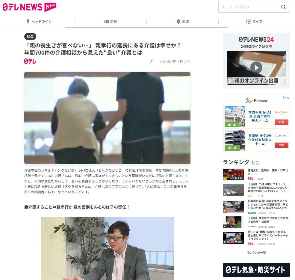 日テレNEWSにて『「親の長生きが喜べない…」 親孝行の延長にある介護は幸せか? 年間700件の介護相談から見えた“良い”介護とは』が掲載されました