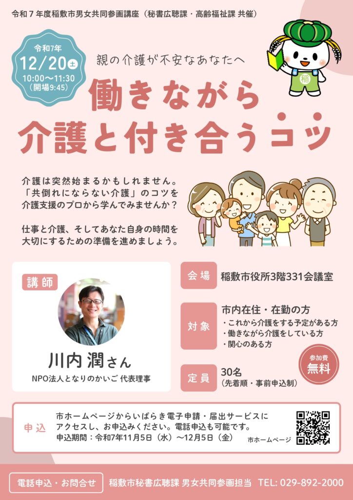 茨城県稲敷市『「親の介護が不安なあなたへ 働きながら介護と付き合うコツ」』に川内が登壇させていただきます。