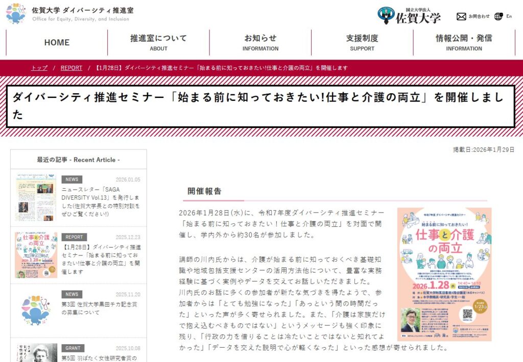 国立大学法人佐賀大学が主催したダイバーシティ推進セミナー『始まる前に知っておきたい!仕事と介護の両立』のレポートが公開されました。